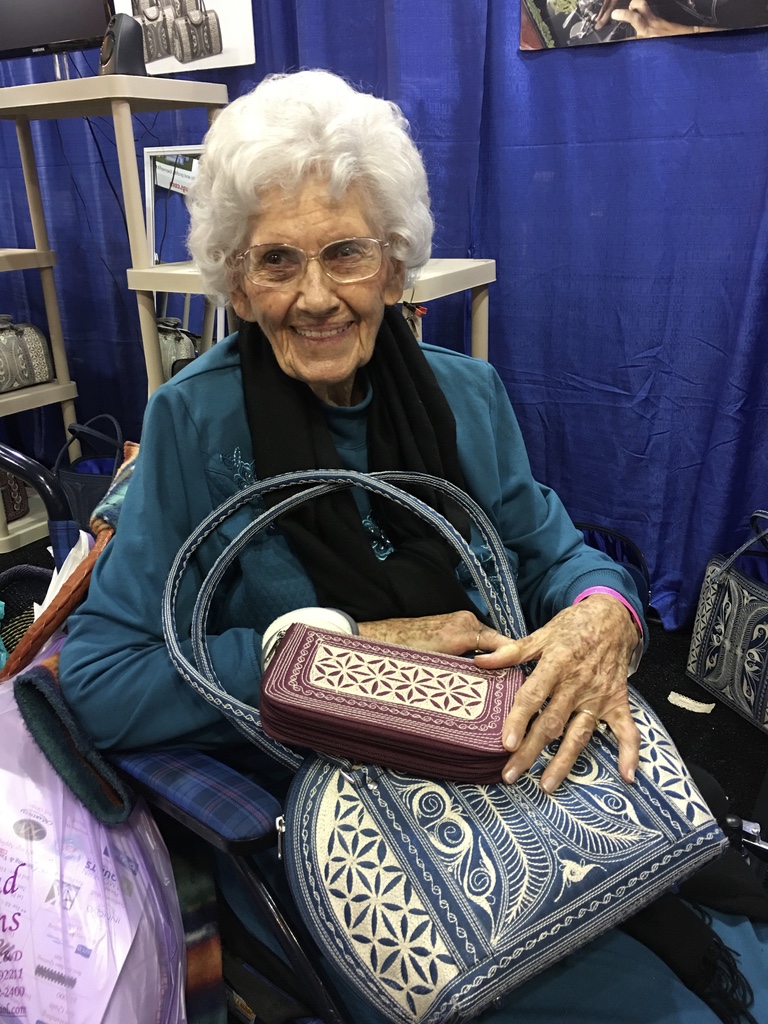 There was one very special lady who really touched my heart… Mary is 92 years old. She came back to our booth again + again during the show + spent quite a bit of time picking out the exact right Laga handbag, here shown in our patriotic colors Red, White and Blue, and wallet in Dark Blue and Black. She didn’t want them to be “matchy matchy” but was so very happy in being able to support our important work. Isn’t she just absolutely adorable?